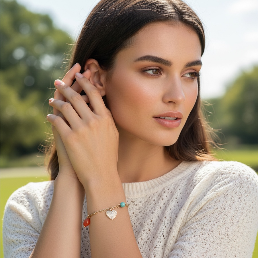 Golden charm bracelet adorned with corals gems, jade beads and a golden heart. Finished with a 14 ct. golden plating this bracelet will complement your look!