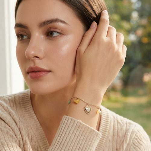 Deze gouden ketting is versiert met een lichtbruine agaat steen en lichtgroene agaat kralen. Een gouden hart en een 14 karaat gouden plating maken dit sieraad tot een mooie aanwinst voor je sieraden collectie.